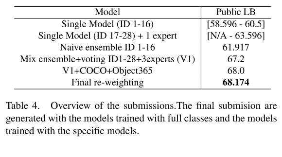 作者使用不同的模型结构、数据集、类别划分策略、数据增强和监督训练了28个检测器。首先使用上面提到的朴素模型集合具有相似设置的检测器,从而将检测从28减少到11。然后我们设计并启动了一个自动集成方法,将它们合并为1。